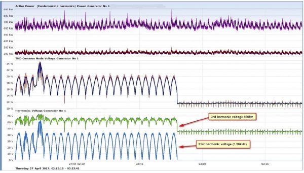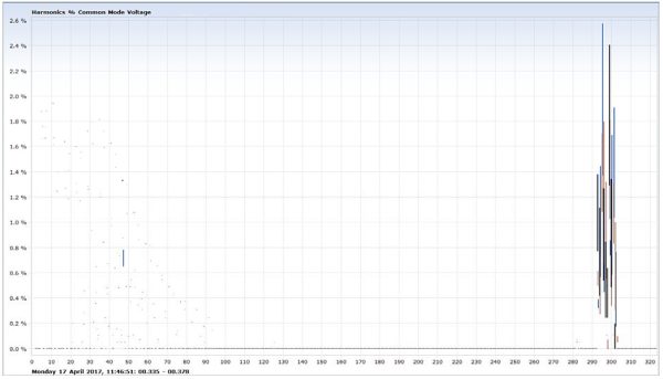 Cause : The lack of a proper L-C-L filter was the cause of the excessive 10kHz components. This, plus poor system quality control and lack of compliance with regard to EMC resulted in excessive common mode voltage directly and indirectly attributing to the VFD and local spurious trips.