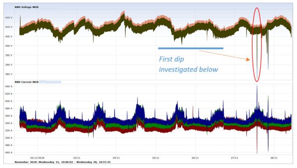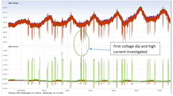 Cause : Full analysis was carried out by Sentinel Power Quality Group The source of the repetitive voltage dips was positively identified as historically incorrectly set-up of a large number of soft-starters on numerous pumps. The soft-starters were set to energise the bypass contactors at around 300V instead of the correct 400V. This would have been realised had the ‘specialist’ PQ company carried out a proper investigation rather than sell a “solution”, the cause of which they were totally aware of. Sentinel Power Quality Group reset all the soft-starter controls and problems were resolved. Had the client purchased the proposed active filters and PFC units, the severe voltage dip problems would have remained.